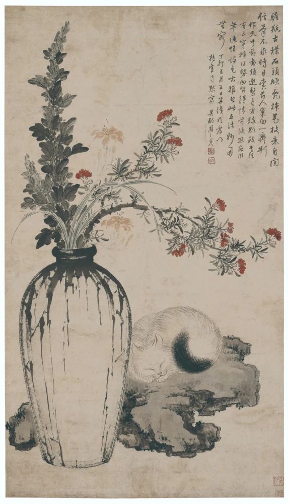 明 周之冕(传)《猫与瓶花》 立轴 设色纸本