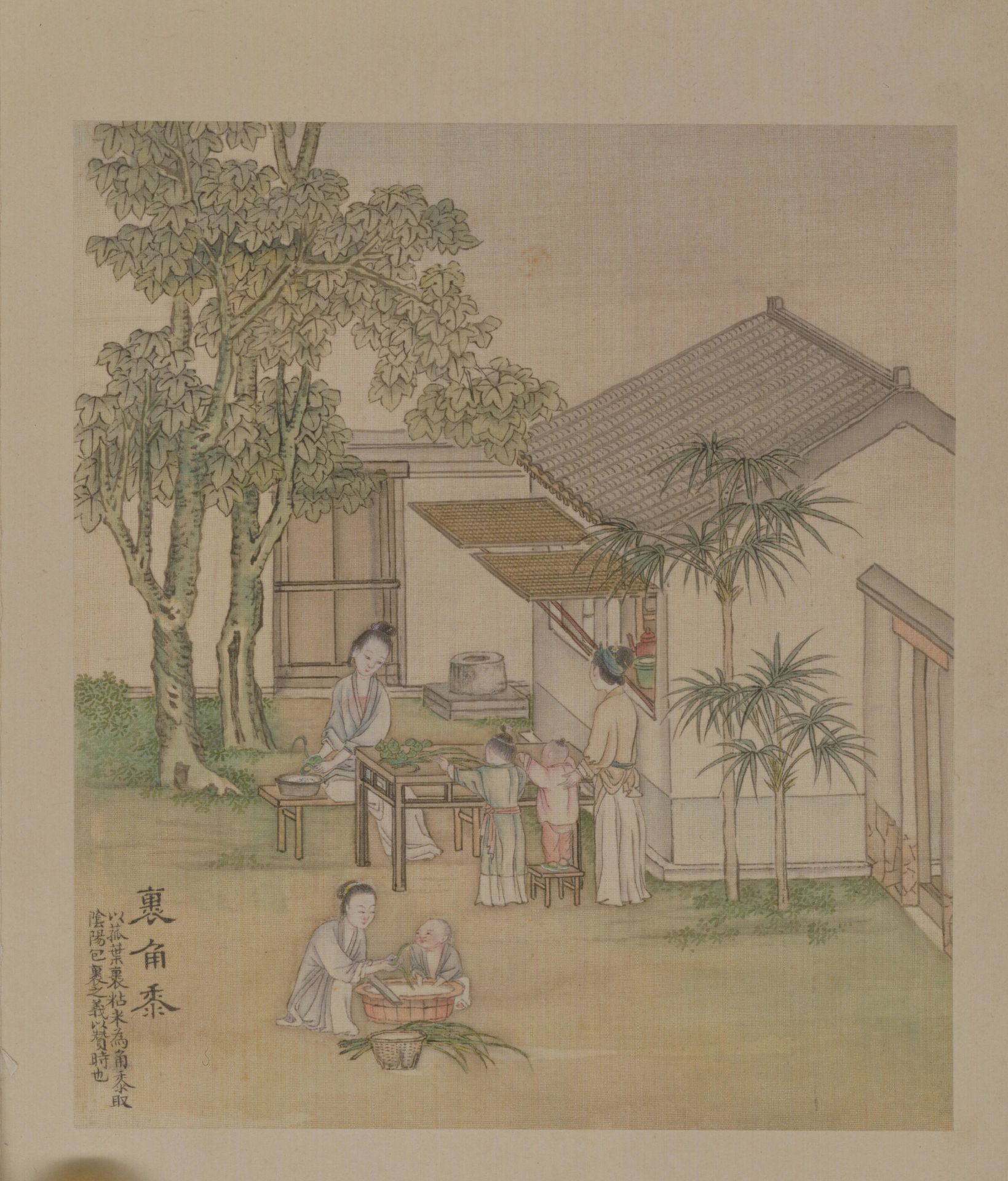 此《端阳故事图册》由清代画家徐扬绘。全套共八幅,分别描绘了端午节期间的重要民俗活动,集中表现了各地的风俗习惯。每开均以隶书题写标题:射粉团、赐枭羹、采药草、养鸲鹆、悬艾人、系采丝、裹角黍、观竞渡,并以行书对画作加以注释。此为绢本设色,现藏于北京故宫博物院。