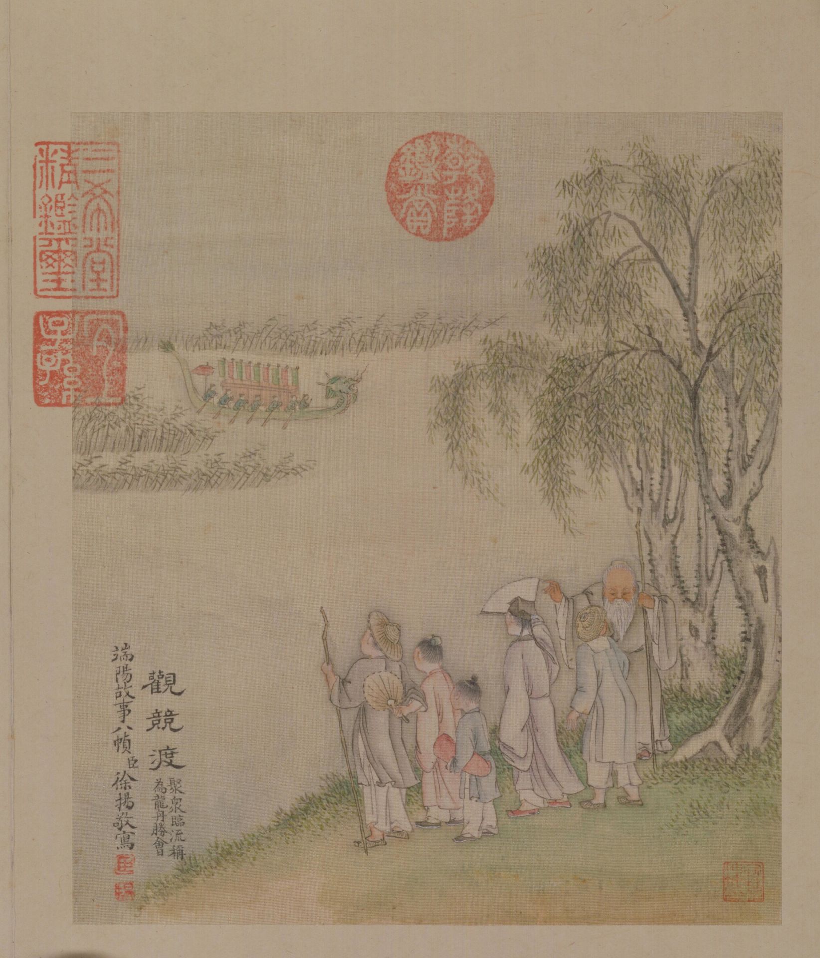 注:《端阳故事图册》包含分帧书签。此本现藏于北京故宫博物院。钤有乾隆皇帝诸方玺印:“乾隆鑒賞”、“三希堂精鑒璽”、“宜子孫”等。