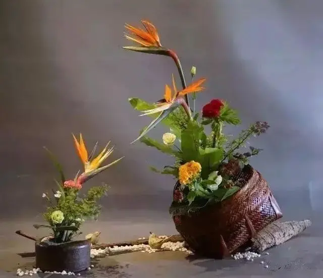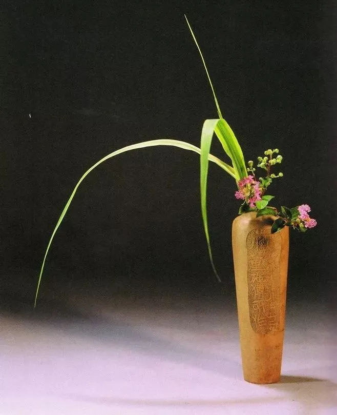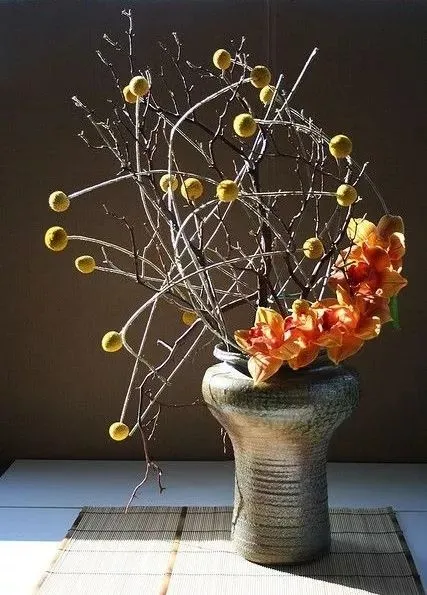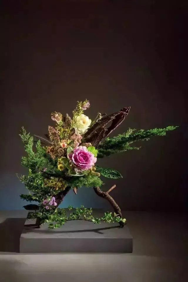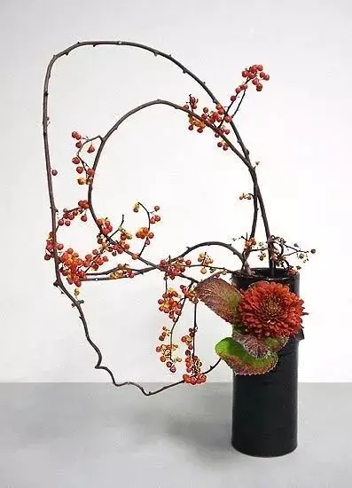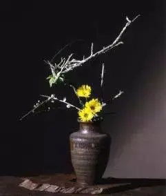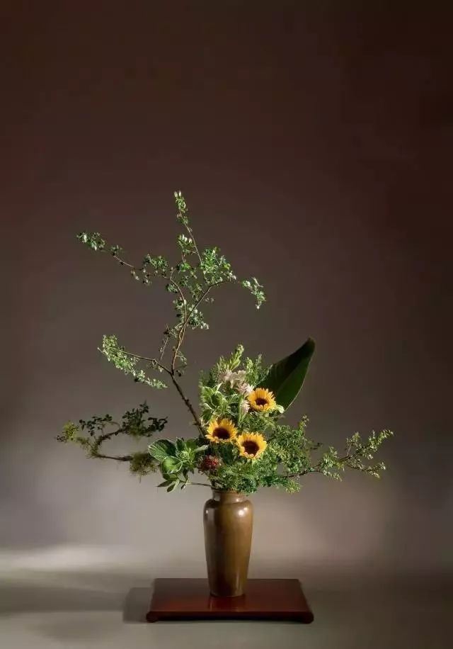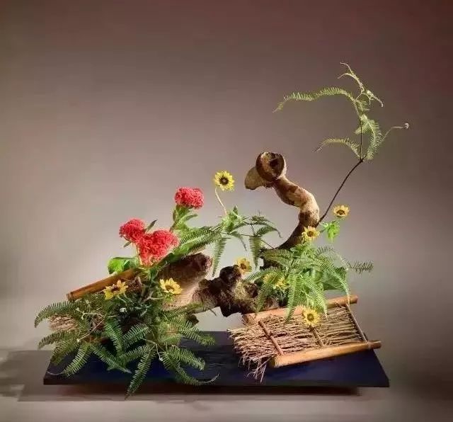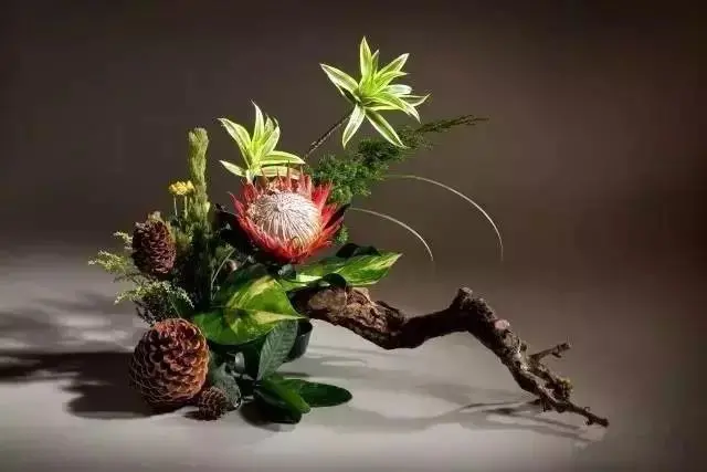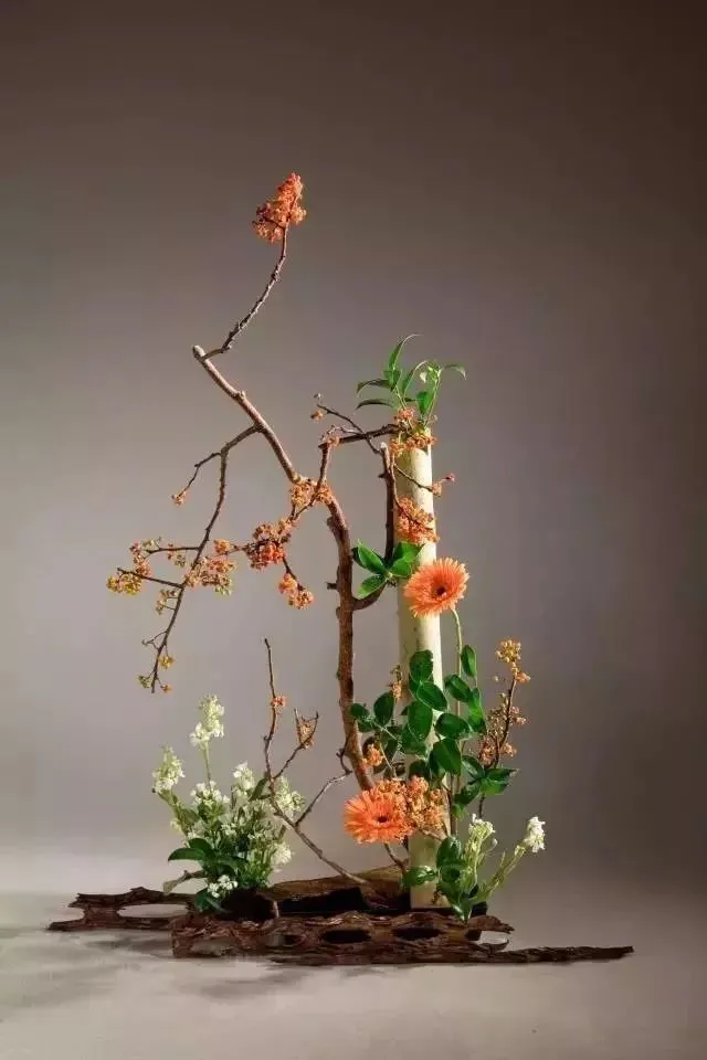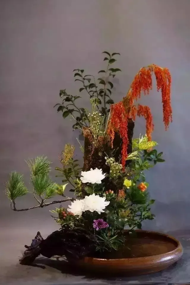 写景花其实就是将看到的自然之景,用花材、叶材在插花中塑造出来,以描写宇宙万象给予人类眼睛的真实感为目的,因此形式美比内容更为重要,以「真」为出发点,有亲切感。