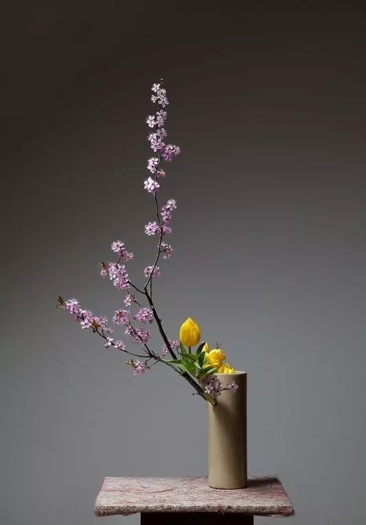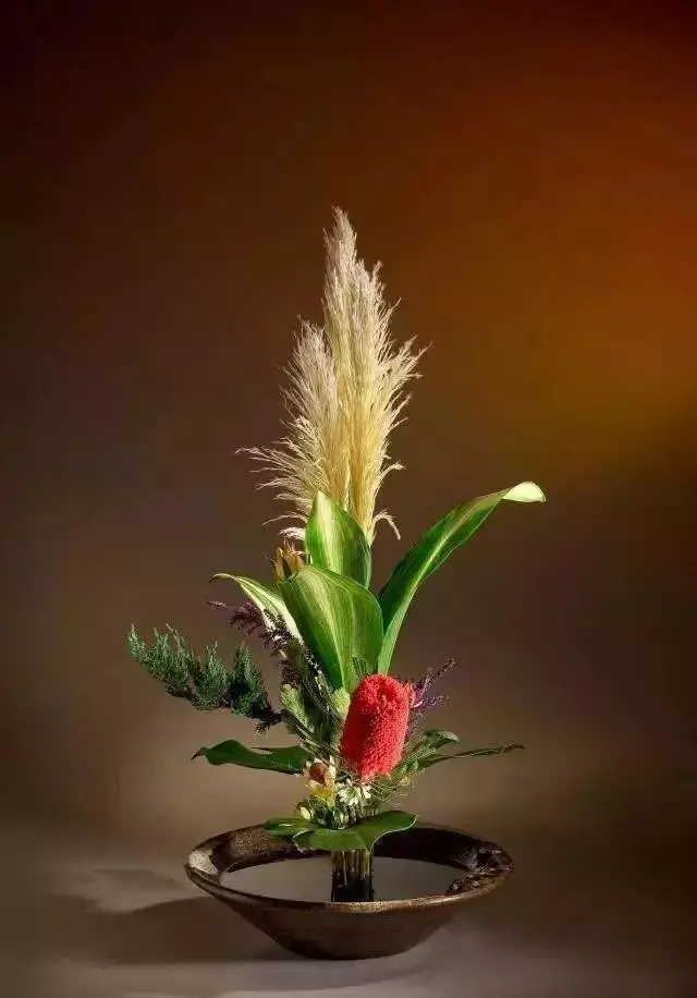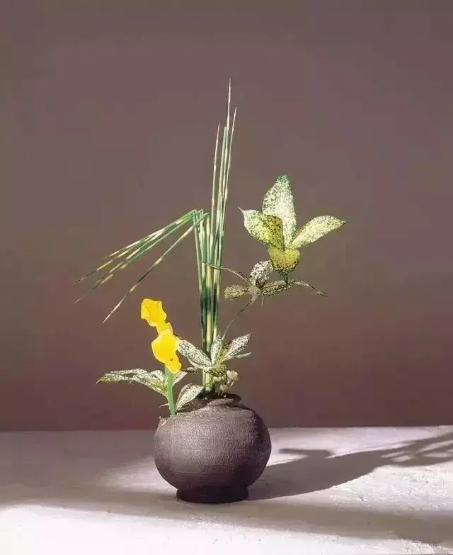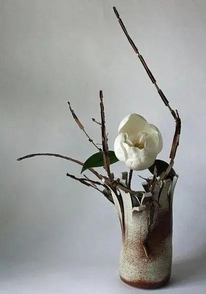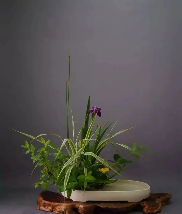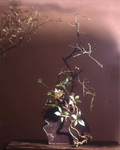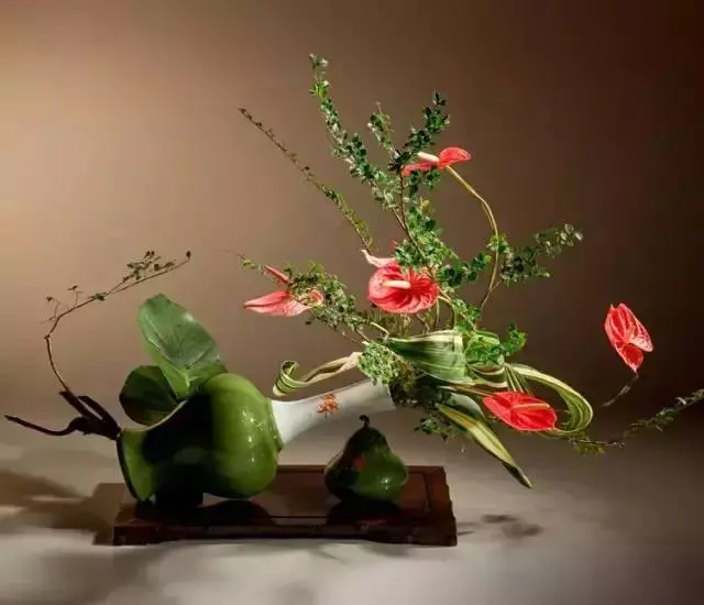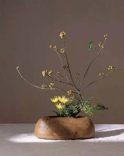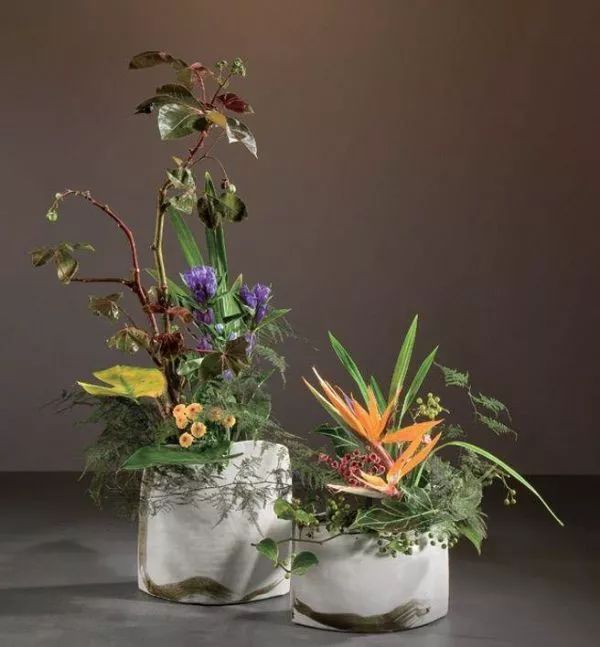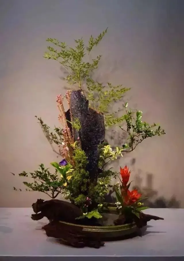 写景花其实就是将看到的自然之景,用花材、叶材在插花中塑造出来,以描写宇宙万象给予人类眼睛的真实感为目的,因此形式美比内容更为重要,以「真」为出发点,有亲切感。