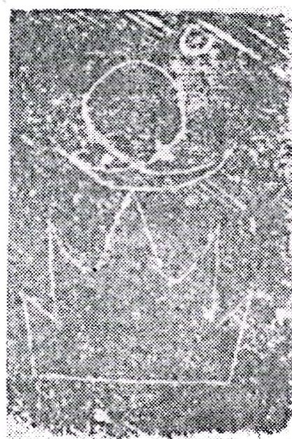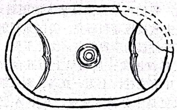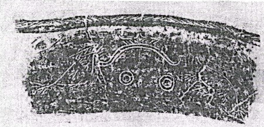 然而,仅据玉琮形态而忽视对兽面纹的研究是不够的,“兽面纹可说是构成良渚玉琮的核心因素,是良渚玉琮的灵魂。而琮体本身从一定意义上讲,只不过是为表现这一灵魂而设的躯壳”,刘斌所论是颇有见地的(32)。一旦玉镯(臂圈)外壁以减地法突出四块弧面,并施刻上兽面纹,便赋予原始宗教色彩,成为神灵寄伏的玉琮了。在河姆渡遗址第四文化层曾出土有一件夹炭黑陶盆(T29④:26),外腹壁阴刻有抽象的二组图案:一组为鱼禾纹,另一组两侧各刻一鸟,中间刻兽目一对,上有如同弓形的冠饰,我怀疑这图象可能是兽面纹的嚆矢(图二)。(33)