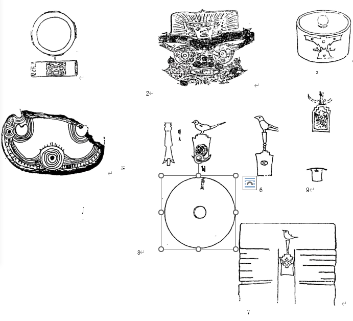 1. 张陵山镯式玉琮(M4:02)2.琮玉上精刻的“神徽”(M12:98)3.美国弗利尔美术馆藏玉臂圈(虚线图,系刻在背面)4.河姆渡象牙雕刻蝶形器 5.(A璧)图象6.美国弗利尔美术馆藏玉璧立鸟图象(C壁)7.首都博物馆玉琮立鸟图象8.余杭安溪出土良渚文化玉璧及其图象 9.美国弗利尔美术馆藏玉璧图象 10.吉斯拉的玉琮图象