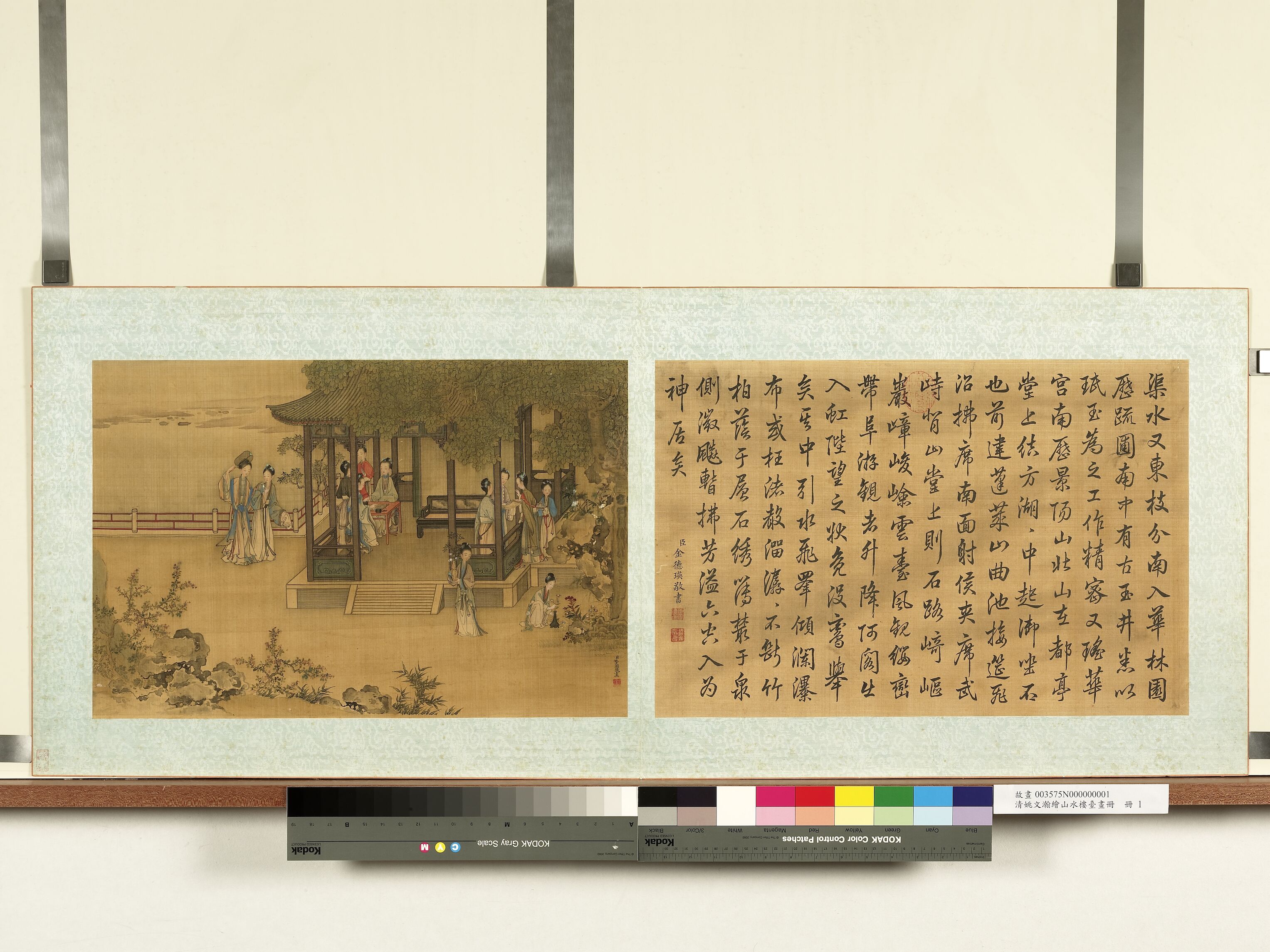 绢本,设色,49.7x123.7,台北故宫博物院藏。此图左侧由姚文瀚绘画,右侧文字由金德瑛书写。绘后宫中景色,小亭内外数位女子或折花插瓶,或下棋对奕,或执扇攀谈。。。,填补着无聊且日复一日的生活。人物穿着考究,仪态端庄大方。