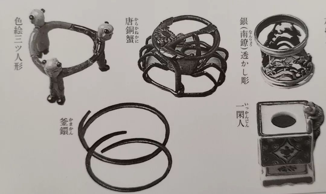 剑山、叶束、配木(留木)等这些用于花材固定的道具被总称为“花留”。《生花早满奈飞》中记录了例如“蟹”“兔”“二重鲤”“龙”“观世水”“碇”“五德”等各种类型的花留。它们一般都是金属质地,多用于扁平花器。花留凝聚了古代手艺人无尽的心血和丰富的智慧,它不仅用来固定花枝,本身也有令人欣赏的美丽特质。